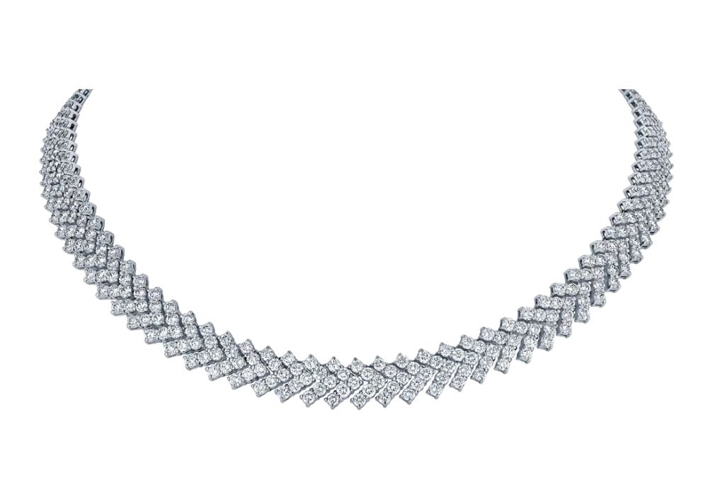 Imagine a waterfall of brilliance. These show-stopping pieces often feature multiple strands of diamonds that drape beautifully down the chest.