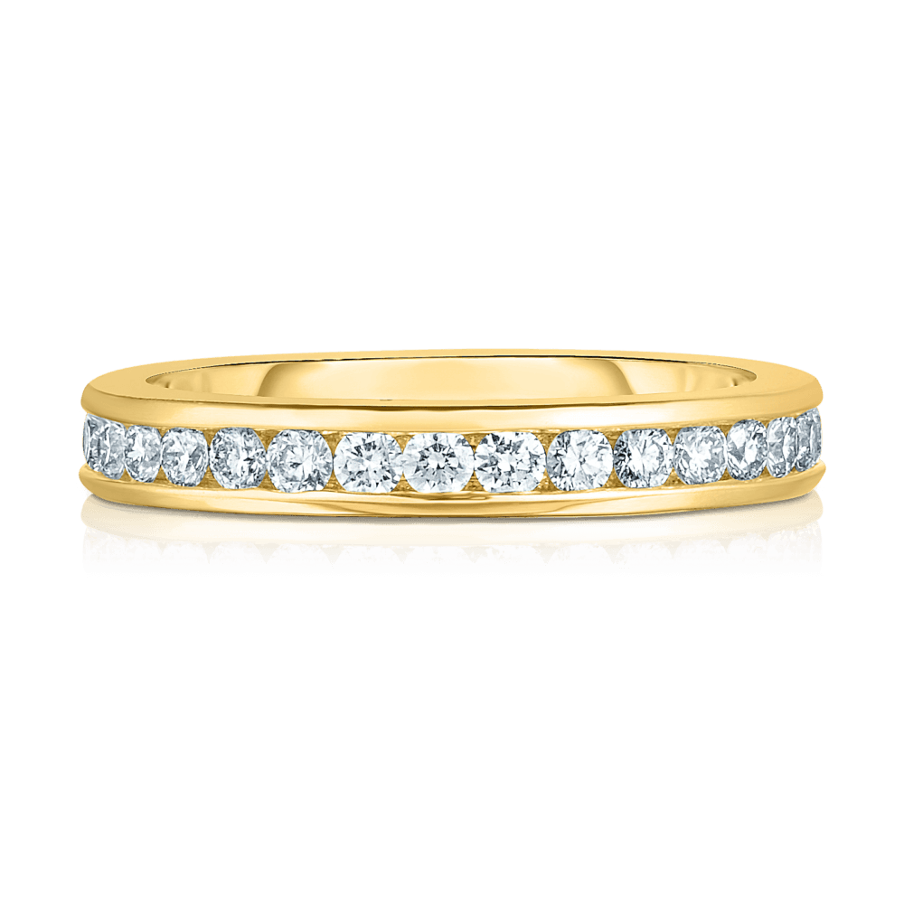Channel settings are clean and structured, with small diamonds set into a groove between two strips of metal. The stones sit flush with the surface, giving the design a smooth, seamless feel.