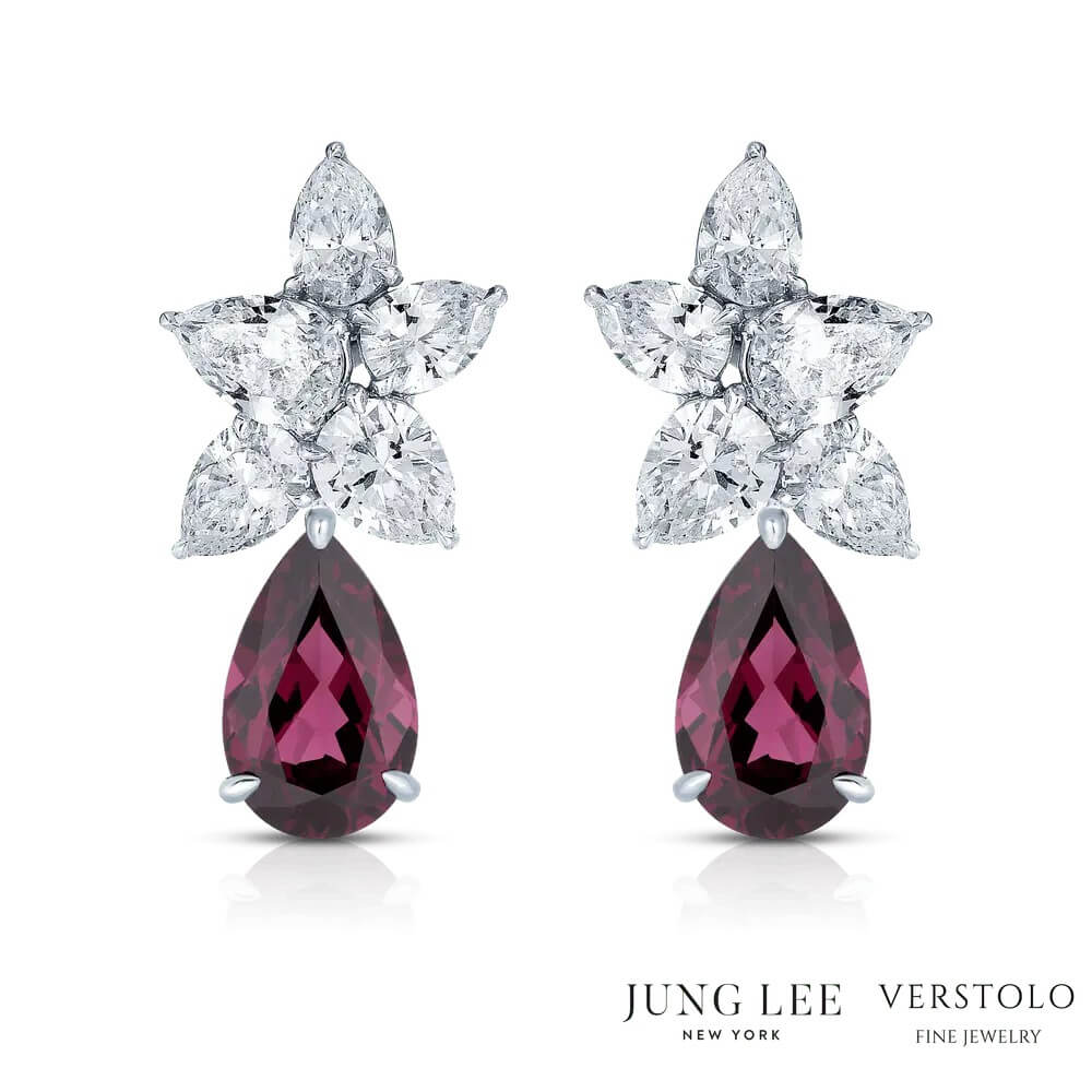 The combination of garnets and diamonds creates a bold yet refined look, ideal for statement-making brides. Our Jung Lee X Verstolo’s Day-to-Night Collection features a vibrant pair of pear-shaped Garnets to add to Kate, Grace, or Lucy diamond drop earrings.