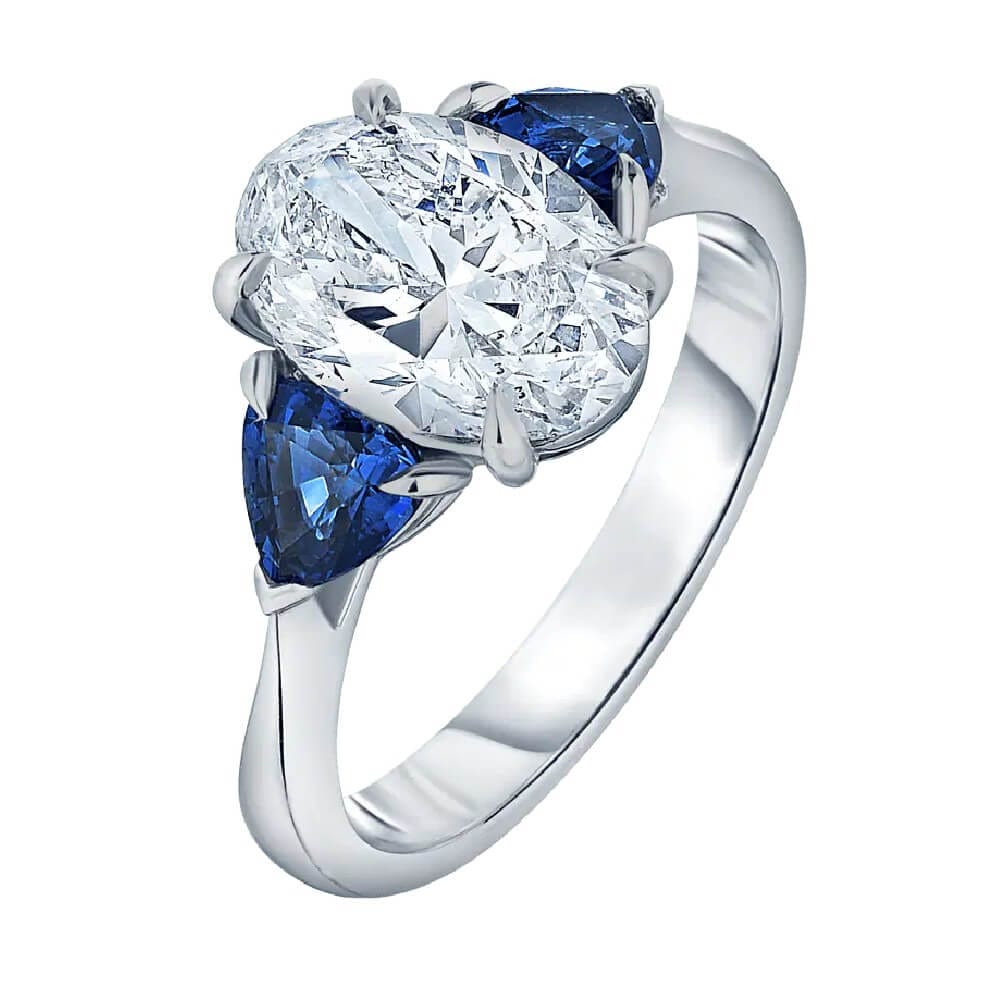 Oval engagement ring featuring two sapphire trillions set in Platinum