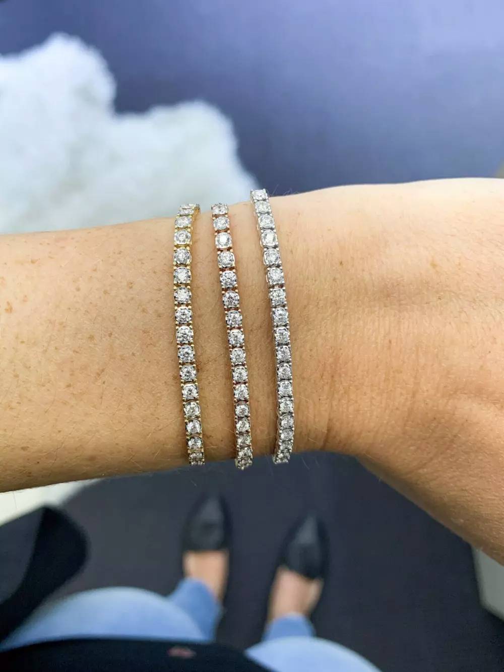 A tennis bracelet should encircle your wrists without being too tight or too loose, sliding up and down the arm easily without falling off.